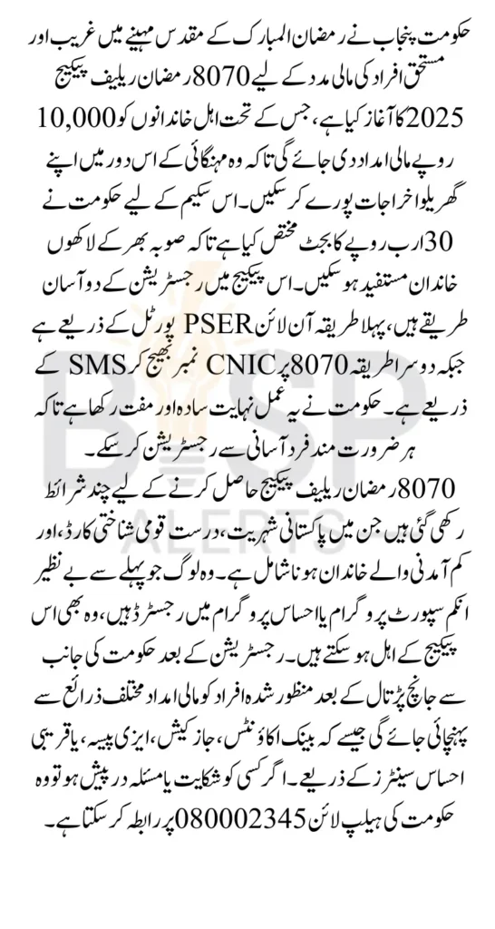 8070 Ramzan Relief Package 2026 Government of Punjab has launched the 8070 Ramzan Relief Package 2026 to support millions of deserving families during the holy month of Ramadan. Rising inflation and increasing living costs have made it difficult for low-income households to manage basic needs. To reduce this financial burden, the Punjab government is offering Rs. 10,000 to eligible families so they can observe Ramadan peacefully and purchase necessary items like food and groceries.