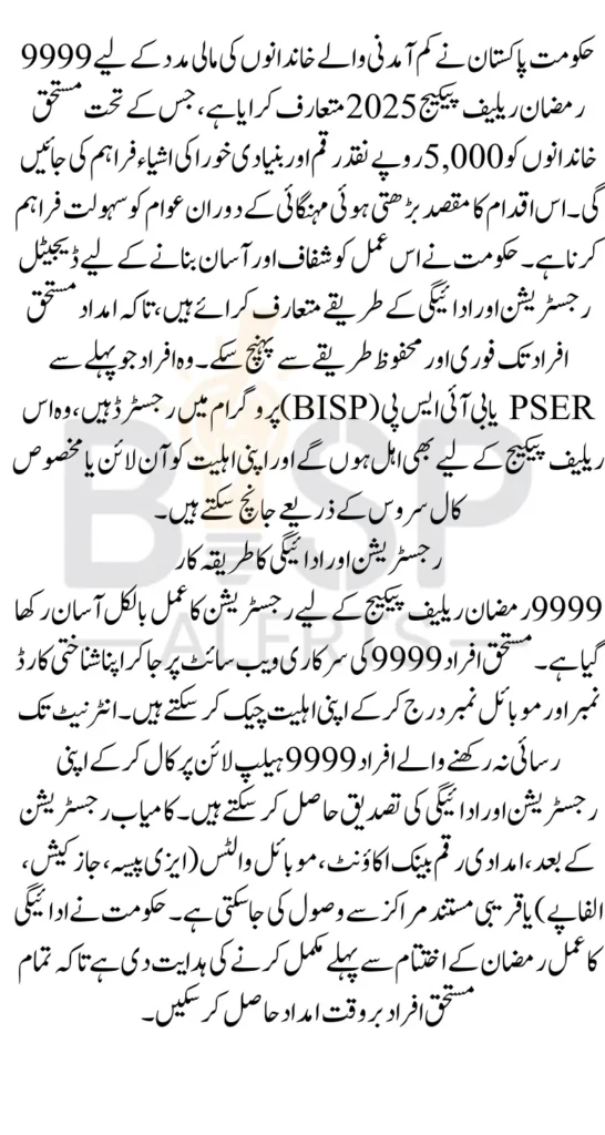 9999 Ramzan Relief Package 2025 Government of Pakistan has introduced the 9999 Ramzan Relief Package 2025 to provide financial assistance to low-income families during the holy month of Ramadan. With rising inflation and increased living expenses, this initiative aims to ease the financial burden by offering PKR 5,000 in cash along with essential food supplies. The process is designed to be transparent and accessible, with digital registration and payment methods. In this detailed guide, we explain how to check eligibility, register, and access the call service for the 5000 payment.