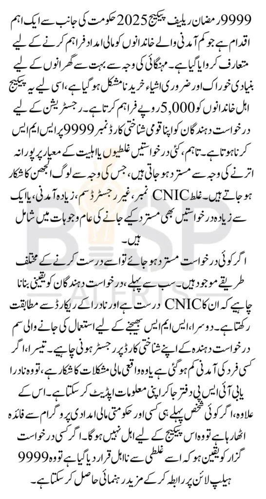 The 9999 Ramzan Relief Package 2025 is an important government initiative aimed at helping financially struggling families. However, many applications are rejected due to small mistakes such as incorrect CNIC entries, unregistered SIM cards, or income ineligibility. By understanding the common reasons for rejection and following the correct registration process, applicants can avoid mistakes and improve their chances of receiving financial assistance.