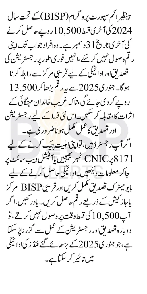 The Rs. 10,500 payment is the last installment under the BISP for the year 2024. Beneficiaries who have not yet claimed their amount are urged to act immediately, as the deadline to receive this payment is just one day away. Missing this deadline could result in complications or delays in receiving the increased amount of Rs. 13,500 starting in January 2025.