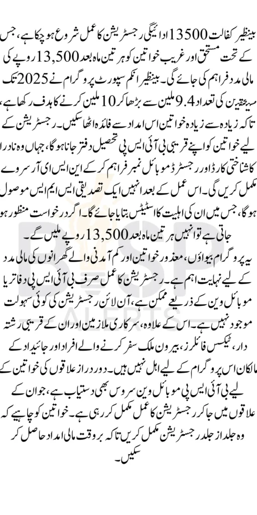 Benazir Kafalat 13500 Payment Registration has officially started new registrations, offering financial support of 13500 per quarter to poor and deserving women across Pakistan. The Benazir Income Support Program aims to expand the number of beneficiaries from 9.4 million to 10 million by 2025, ensuring more women can receive financial aid.