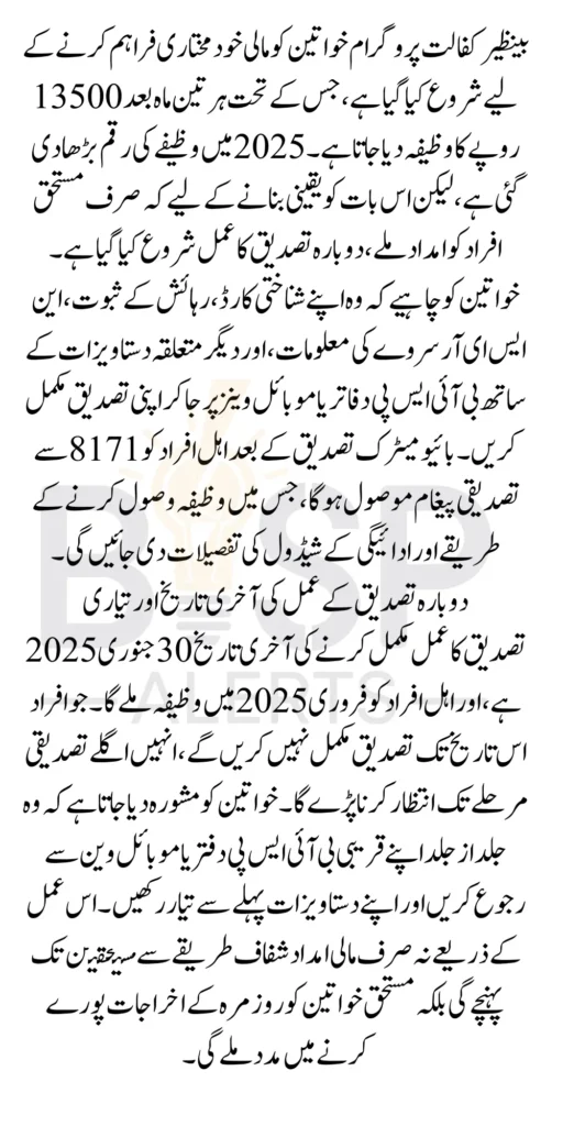 The Benazir Kafalat 13500 Stipend Re-Verification Process 2025 is an important step to ensure that the financial assistance reaches the most deserving women. By completing the verification process through the BISP Mobile Van or office, women can continue receiving their stipend and improve their household’s financial stability. Remember, the deadline to complete the re-verification is January 30, 2025.