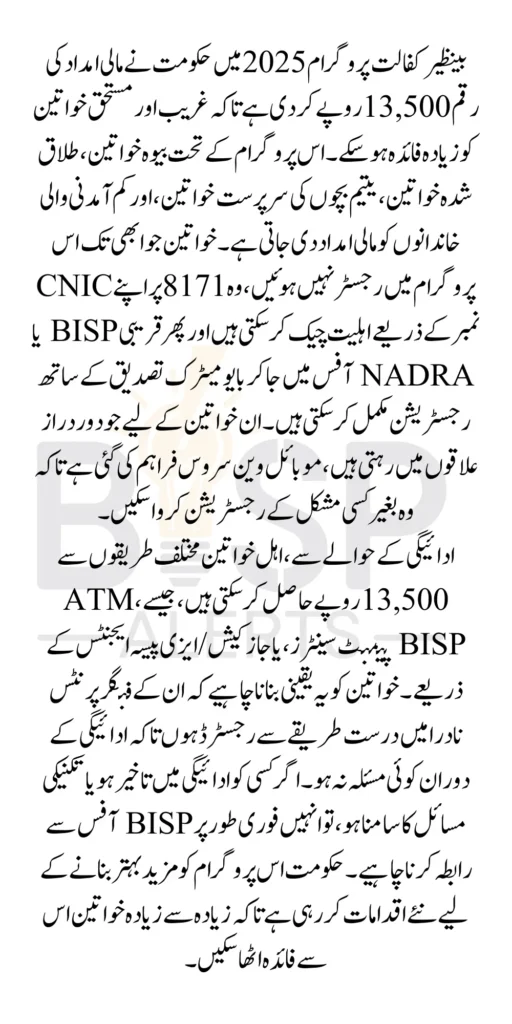 The Benazir Kafalat Program 2025 is a crucial initiative that provides financial support to poor and deserving women across Pakistan. With the increased amount of Rs. 13,500, eligible women can improve their financial stability and support their families.