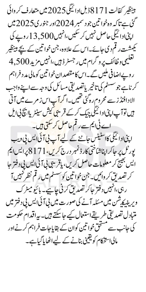 The Benazir Kafalat 8171 Double Payment of Rs. 13,500 is an important initiative aimed at helping previously registered women receive financial assistance that they missed in earlier months. If you are eligible, do not delay in checking your payment status and collecting your funds.
