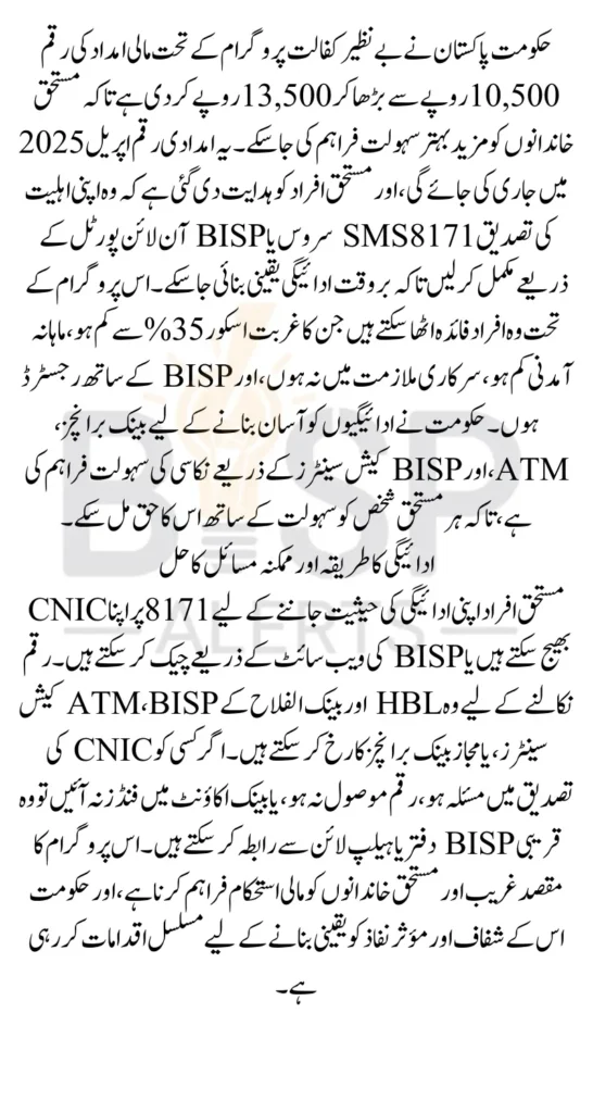 Benazir Kafalat 8171 New 13500 Payment Release Date This initiative plays a vital role in supporting low-income households, and with the increase in the payment amount, the government aims to provide greater financial stability to those in need. If you or someone you know is eligible, make sure to follow the steps mentioned in this guide to receive the upcoming Rs. 13,500 installment on time.