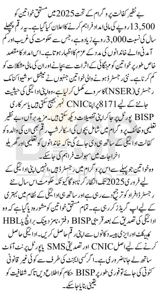 The new payment release has been prioritized for women who recently completed their National Socio-Economic Registry (NSER) survey and passed verification. These individuals can check their payment status by sending their CNIC number to 8171 via SMS or by visiting the official BISP portal. This payment aims to provide much-needed relief to families struggling with economic hardships, ensuring that they receive timely financial assistance for essential needs.