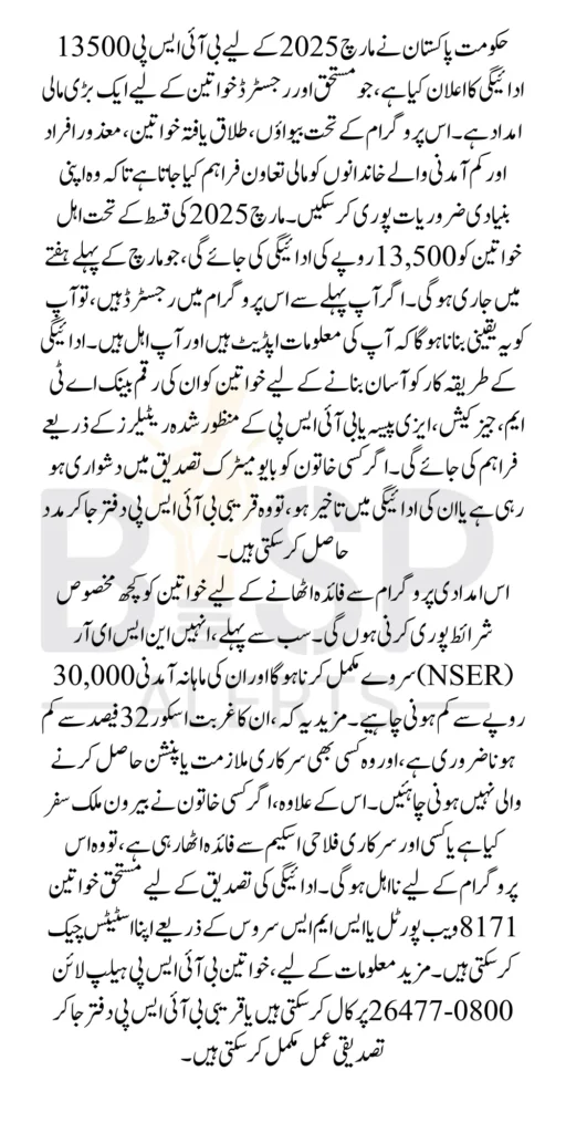 BISP 13500 Payment Notifications March 2025 Government of Pakistan has officially announced the BISP 13500 Payment for March 2025, aiming to provide financial support to registered women under the Benazir Income Support Program This initiative is crucial in assisting widows, divorced women, disabled individuals, and other low-income families who rely on this financial aid to meet their daily needs.
