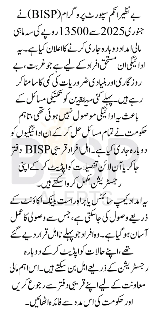 The BISP 13500 payment is a quarterly aid program aimed at supporting the poorest segments of society. Due to economic challenges, many individuals have faced reduced income, unemployment, and struggles in meeting basic needs. This payment helps those individuals cover essential expenses, especially food and basic utilities. However, several beneficiaries missed out on this vital support in previous months due to various reasons. Now, the government has announced that the 13500 payment will be reissued for the affected individuals.