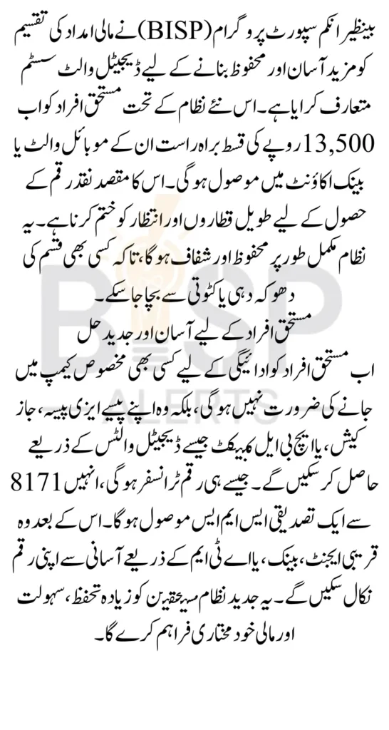 BISP 8171 Payment 13500 Digital Wallet System is a major step towards modernizing financial support systems in Pakistan. By reducing the dependency on physical payment centers, this system offers more convenience, speed, and security to millions of deserving families.