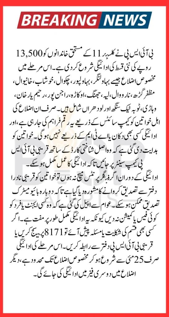 These districts form the Cluster 11 group and have been prioritized for the final payment rollout. Beneficiaries are advised to reach out to the same BISP center they have previously visited for payment.