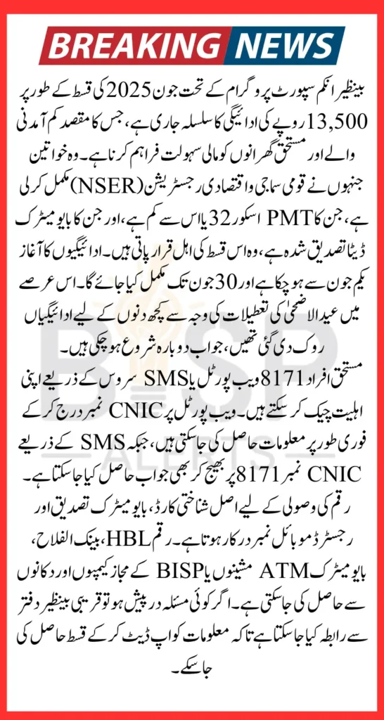 The Government of Pakistan continues to support deserving families through the BISP, offering a financial installment of Rs. 13,500 in June 2025. This amount is being provided to eligible households under the regular quarterly payments announced through the 8171 web portal. The main aim of this initiative is to reduce the financial burden on low-income families and ensure smooth and timely distribution before June 30, the final date for collection.