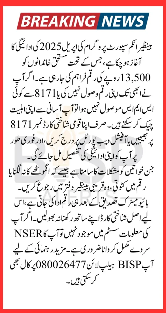 BISP is a vital lifeline for millions of families across Pakistan, and the April 2025 installment of Rs. 13,500 is much needed during rising inflation. The process has been simplified, but only those who complete their verification steps on time will receive payments. Don’t wait for the last date. Use your CNIC to check your status on the 8171 portal, confirm your district’s schedule, and collect your payment safely from the right channel.
