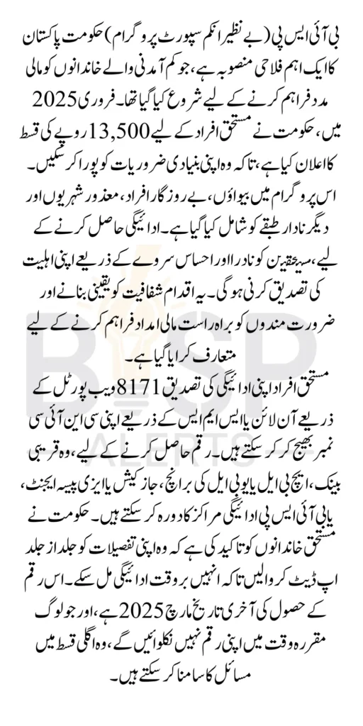 The Benazir Income Support Program is a social welfare initiative introduced by the Government of Pakistan to provide financial relief to vulnerable households. It plays a crucial role in alleviating poverty by offering direct cash transfers to those in need. Over the years, BISP has evolved to ensure transparency and efficiency in fund distribution. In February 2025, the government has once again announced a new installment of Rs. 13,500 for eligible families, ensuring economic stability and relief for those facing financial hardships.