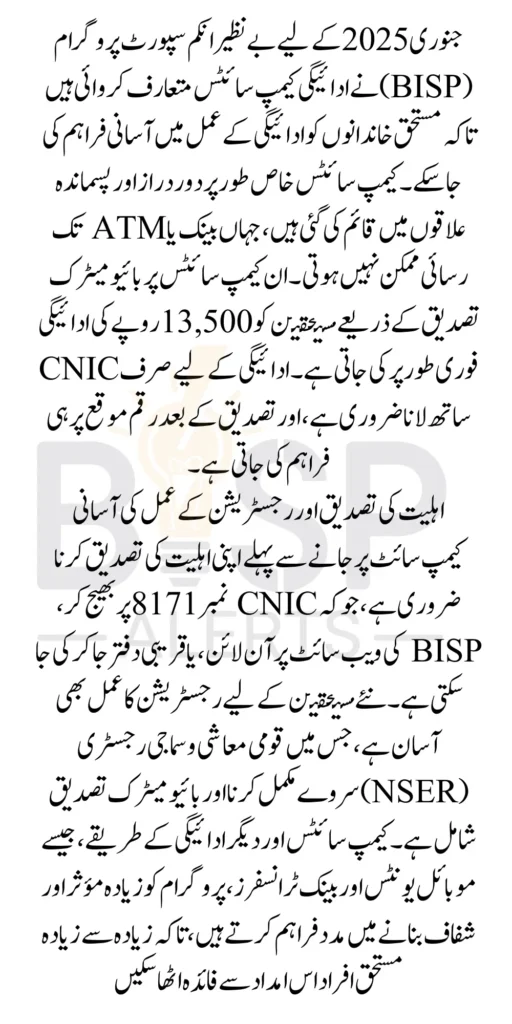 - Find out where the BISP January 2025 Payment Campsites are located in your area. These campsites are set up in underserved regions to make it easier for you to access your payment.