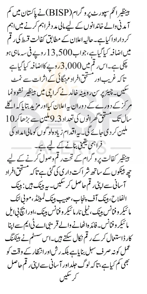 BISP Kafaalat 13500 Payment List of 6 Banks The Benazir Income Support Programme has been a lifeline for low-income families in Pakistan, providing essential financial assistance to help them meet their daily needs. With the government’s latest announcement of an increase in the quarterly Kafaalat payments, beneficiaries can now look forward to receiving 13500. This article outlines the key updates and provides a complete list of banks where you can withdraw your BISP payment.