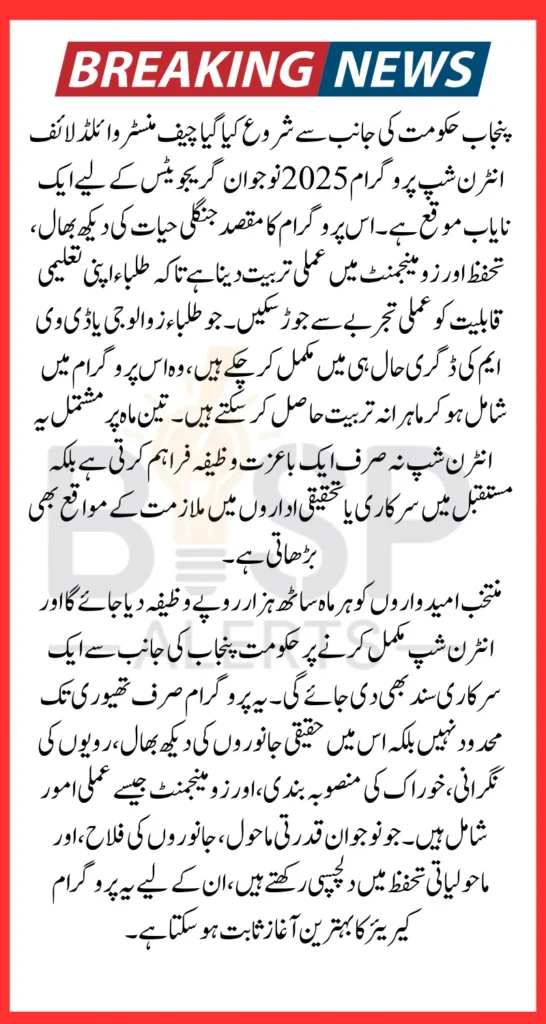 The Chief Minister Punjab Wildlife Internship Program 2026 is more than an internship—it’s a platform for shaping the future of wildlife care in Pakistan. From hands-on experience to a well-paying stipend, and from expert supervision to a government-recognized certificate, this program offers all the right tools to begin a meaningful career.