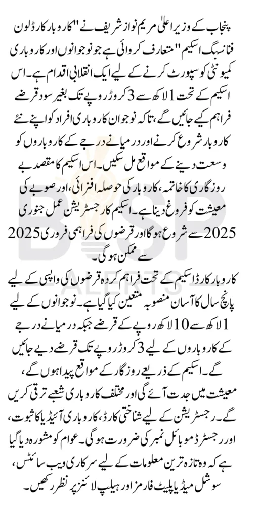 The Karobar Card Loan Financing Scheme is a visionary step by Chief Minister Maryam Nawaz Sharif to empower the youth and the business community in Punjab. With interest-free loans and a flexible repayment structure, this program eliminates financial barriers and opens doors for countless individuals to realize their entrepreneurial dreams.