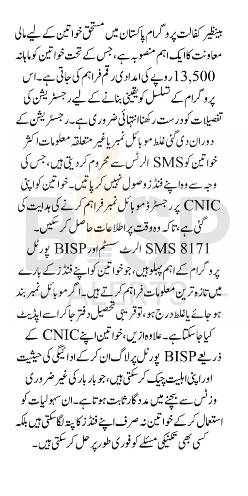 The 8171 SMS alert system is a vital tool for keeping beneficiaries informed about the release of their payments. These alerts notify women when their funds are available, saving them from unnecessary trips to BISP Cash Centers. Unfortunately, some beneficiaries miss these notifications due to blocked or outdated mobile numbers.