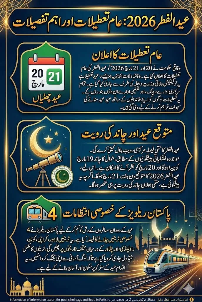 The announcement also comes along with predictions about the Shawwal moon sighting and special arrangements by Pakistan Railways to manage the increase in travel during the festive season.