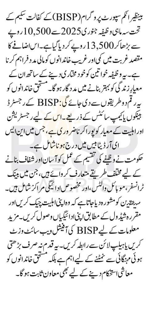 BISP Stipend Increase January 2025 the quarterly stipend under the BISP Kafaalat scheme will increase from 10500 to 13500. This move highlights the government’s commitment to alleviating poverty and providing financial stability to deserving households.