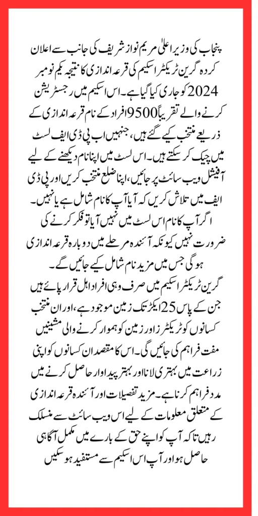 Green Tractor Scheme Qurandazi The tractor scheme was announced by Chief Minister Punjab Maryam Nawaz Sharif and the people who had applied and registered in it are still worried because of the lack of results, so there is no need for them to worry because As of 1st November 2024, those who had registered have been drawn and their names have been published on the official website through PDF. Go to the official website and search your name in the PDF there and check whether you are eligible or resolved in this scheme, Punjab Chief Minister Maryam Nawaz Sharif has given this to 9500 people.