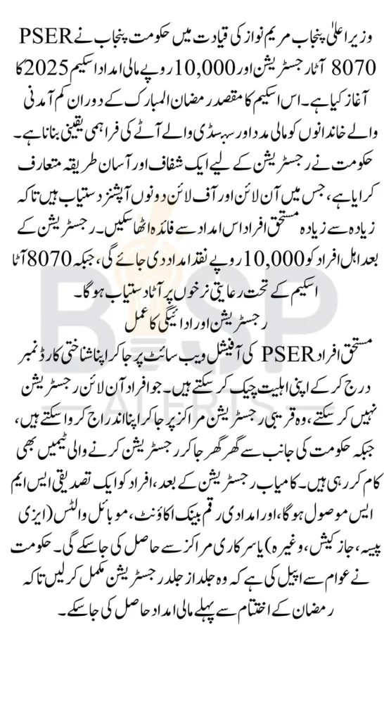 The PSER 8070 Atta Registration and 10,000 Financial Assistance Scheme is a significant step towards providing relief to low-income families during Ramadan 2026. By simplifying the registration process and offering both online and offline methods, the Punjab government ensures that every eligible family can benefit. If you meet the criteria, register today to secure the support your family needs.