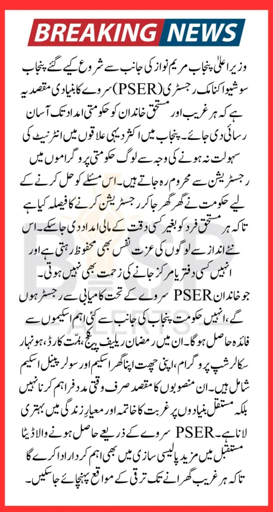 The PSER registration launched by Chief Minister Maryam Nawaz is more than just a survey – it is a revolutionary step towards building an inclusive and fair society in Punjab. By making welfare registration accessible through door-to-door visits, online platforms, and thousands of centers, the government has made sure that deserving families no longer struggle to access support. If your family meets the eligibility criteria, make sure you complete your registration at the earliest and secure the many benefits that could transform your lives for the better.