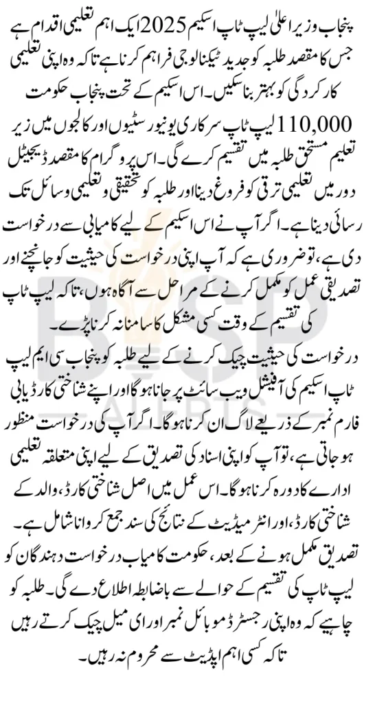 Visit the official Punjab CM Laptop Scheme portal, enter your CNIC/B-Form number, and check your application status.