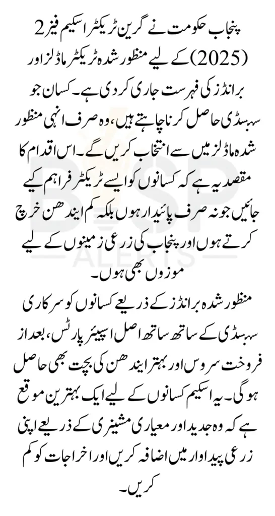 Punjab Green Tractor Scheme Approved Models Punjab Green Tractor Scheme Phase 2 2026 has officially introduced a list of approved tractor brands and models for farmers across the province. This initiative is designed to support small and large farmers by providing subsidies on tractors that are durable, fuel-efficient, and reliable.