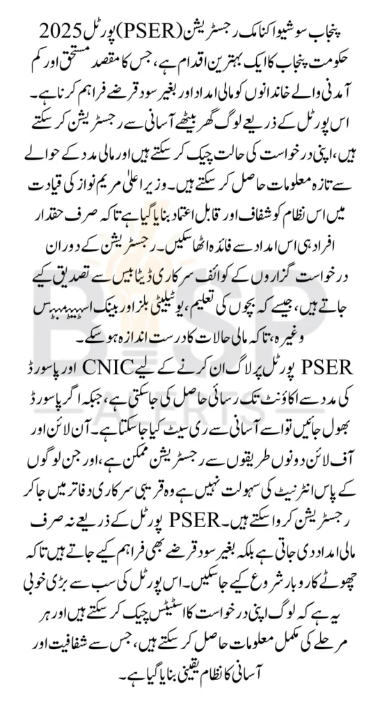 The PSER Portal is a government initiative designed to identify and support financially weak families in Punjab. It aims to help those in need by offering: